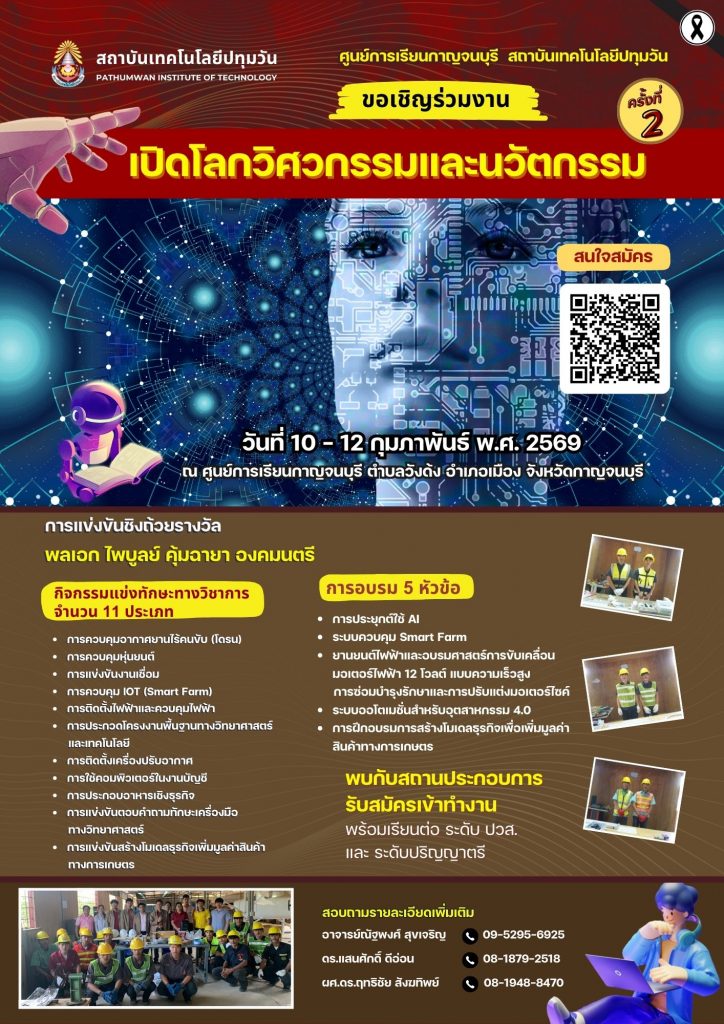 ข่าวประชาสัมพันธ์ ขอเชิญร่วมงานกิจกรรมเปิดโลกวิศวกรรมและนวัตกรรม ครั้งที่ 2 Previous ประกาศ รับสมัครคัดเลือกเข้าศึกษาต่อ สถาบันเทคโนโลยีปทุมวัน ประจำปีการศึกษา 2569