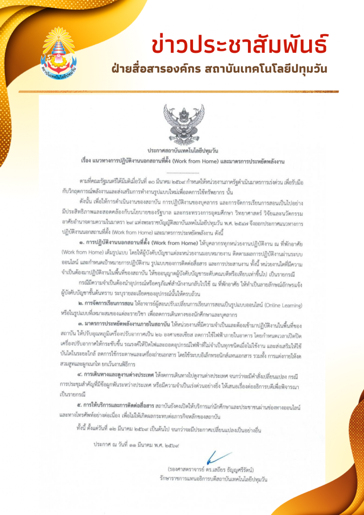 ข่าวประชาสัมพันธ์ ประกาศสถาบันเทคโนโลยีปทุมวัน เรื่อง แนวทางการปฏิบัติงานนอกสถานที่ตั้ง (Work From Home) และมาตรการประหยัดพลังงาน Previous ขอเชิญร่วมงานกิจกรรมเปิดโลกวิศวกรรมและนวัตกรรม ครั้งที่ 2
